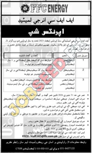 FFC Energy Limited is offering an apprenticeship program under the Sindh Apprenticeship Act 2023 at its FFC IBL Plant Site, Jhimpir, District Thatta (Sindh). Applications are invited from eligible candidates to join different disciplines.