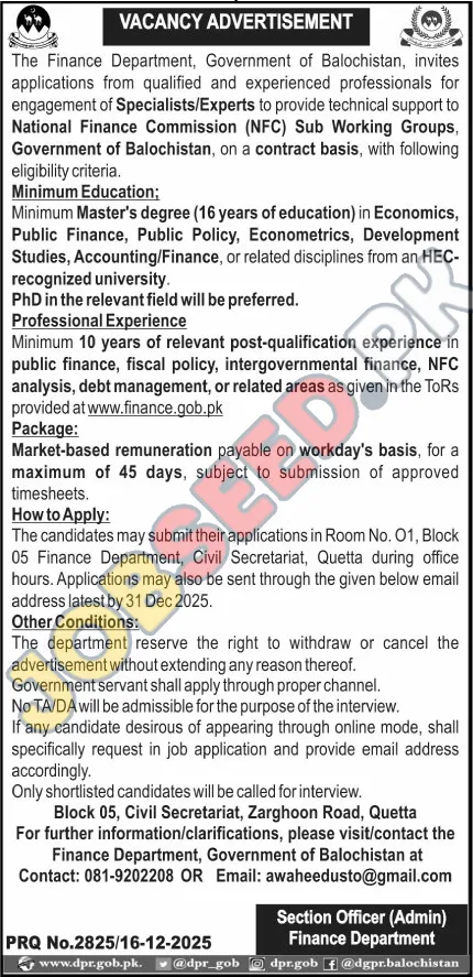 The Finance Department of the Government of Balochistan is inviting applications from highly qualified and experienced professionals for the role of Specialists/Experts. These positions are critical for providing technical support to the National Finance Commission (NFC) Sub Working Groups. The roles are offered on a contract basis, requiring candidates with extensive expertise in public finance and related disciplines.