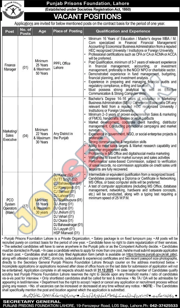 Punjab Prisons Foundation Lahore is seeking talented and dedicated individuals to join their team for contract-based positions. These roles offer a unique opportunity to contribute to a vital organization and develop your professional skills.