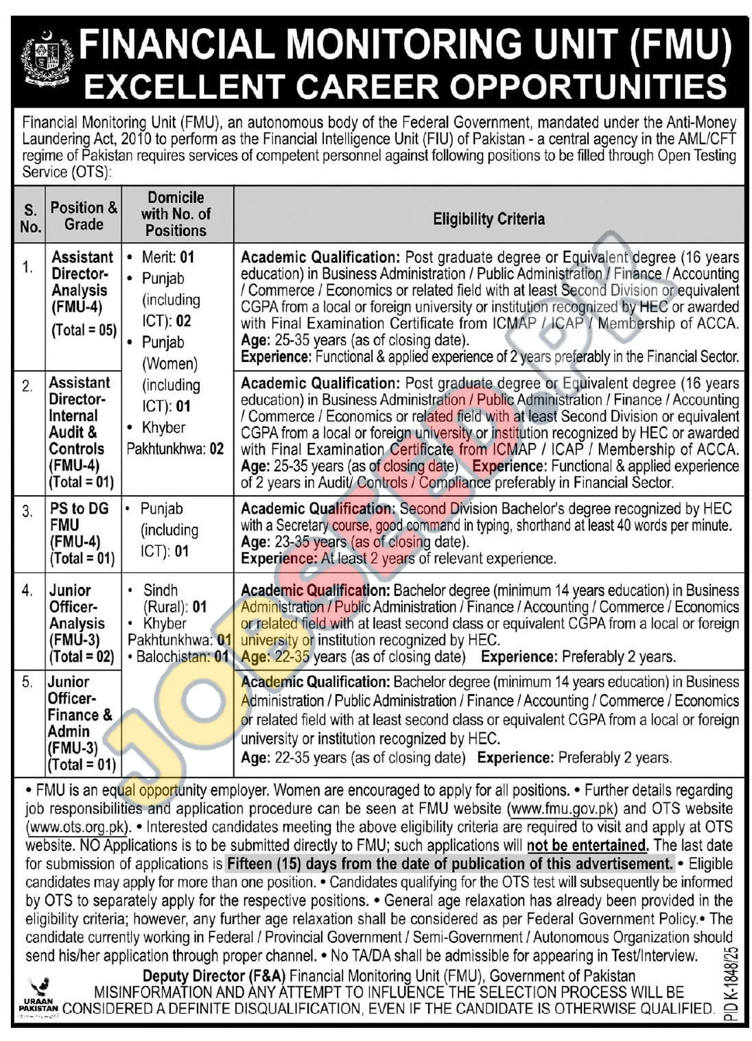 Financial Monitoring Unit (FMU), Islamabad invites applications from eligible candidates for the post of Assistant Director Analysis, Assistant Director Internal Audit & Controls, PS to DG FMU, Junior Officer Analysis and Junior Officer Finance & Admin as per advertisement of 04 December, 2025, published in Newspaper. CA, BA educational qualification will be preferred.