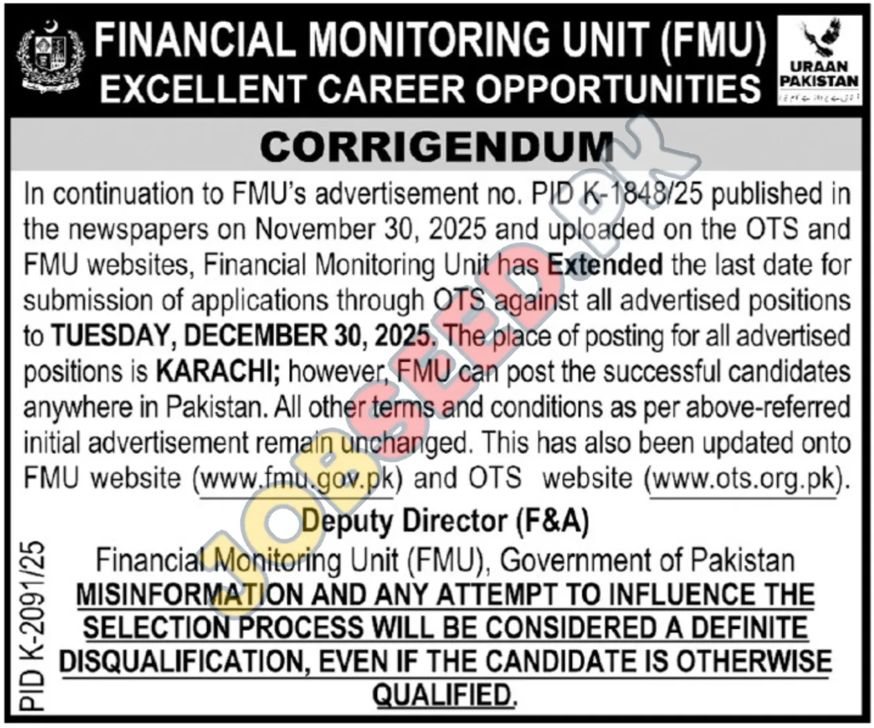 Financial Monitoring Unit FMU, Karachi Sindh Pakistan invites applications from eligible candidates for the post of Deputy Director (F&A) as per advertisement of 18 December, 2025, published in Jang Newspaper. Master educational qualification will be preferred.