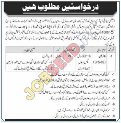 A government organization, the Station Supply Depot, Army Service Corps, is seeking qualified Firefighters for their facility in Naushahro Feroze Cantt. This is an excellent opportunity for individuals seeking career opportunities in the public sector. The advertisement requires candidates to apply within 15 days of the publishing date. This role offers a competitive salary and the chance for professional growth within a well-regarded government establishment. Apply today!