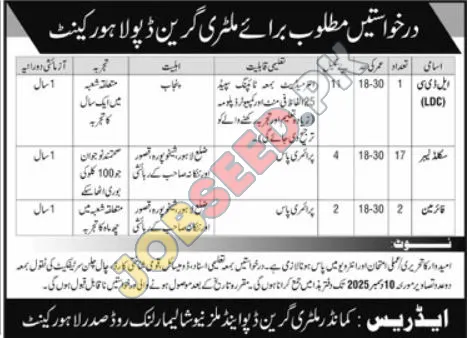 Military Green Depot in Lahore Cantt is announcing multiple job openings, seeking dedicated individuals to join their team. These positions offer a chance to contribute to a vital organization and grow professionally. We are looking for individuals with the right skills and enthusiasm to fill these roles effectively.
