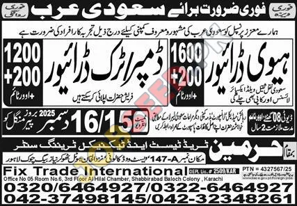 Fix Trade International, Riyadh Saudi Arabia Pakistan invites applications from eligible candidates for the post of Heavy Driver and Truck Driver as per advertisement of 14 December, 2025, published in Express Newspaper. Diploma educational qualification will be preferred.