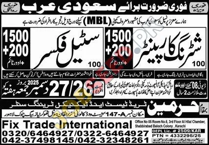 Fix Trade International, Karachi invites applications from eligible candidates for the post of Steel Fixer and Shuttering Carpenter as per advertisement of 25 December, 2025, published in Newspaper. Master educational qualification will be preferred.
