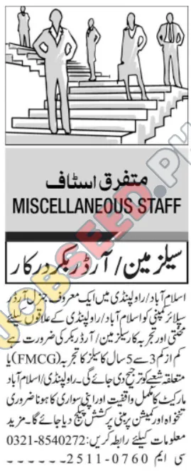 FMCG Company, Islamabad Islamabad Pakistan invites applications from eligible candidates for the post of Salesman / Order Booker as per advertisement of 28 November, 2025, published in Jang Newspaper. Bachelor educational qualification will be preferred.