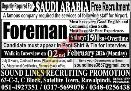 Sound Lines Recruiting Promotion is promoting a foreman position with a famous company located in Saudi Arabia. This is a chance to start your career in an international airport. The selected Foreman will be given attractive offers including good pay and additional compensation for labor.