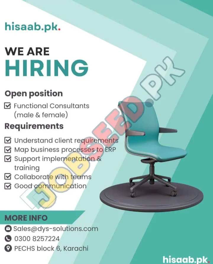Career opportunity at Hisaab.pk located in Karachi for the position of Functional Consultant. This employment notice was announced on 04 December, 2025 through hisaab.pk advertisem. Candidates possessing a BA degree are encouraged to submit their application.
