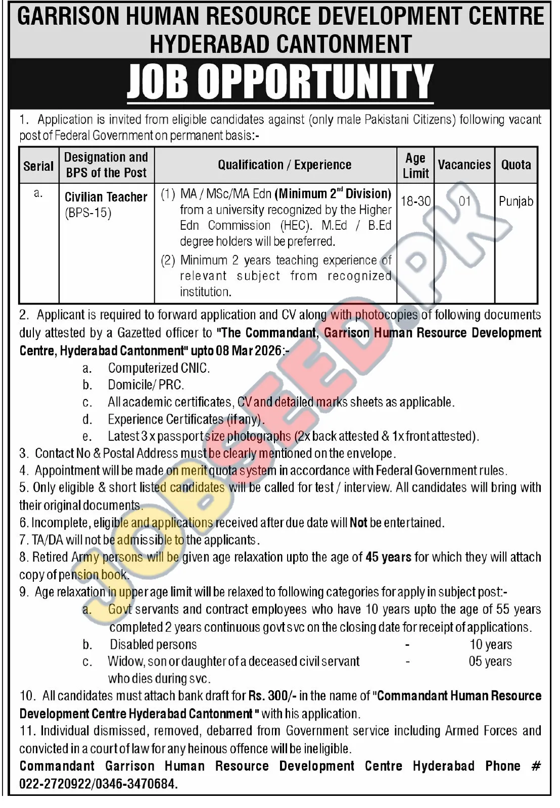 - Contact Information: Commandant Garrison Human Resource Development Centre, Hyderabad. Phone #: 022-2720922 / 0346-3470684.