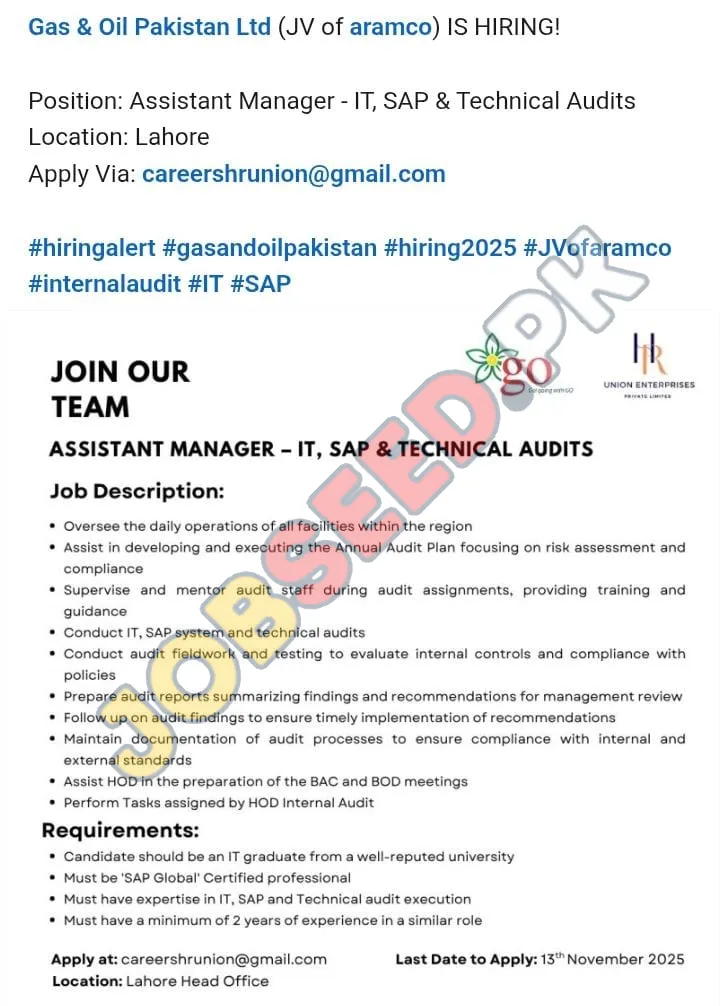 Gas & Oil Pakistan Ltd is seeking a dedicated and experienced Assistant Manager to join their IT, SAP, and Technical Audits department. This role offers an excellent career opportunity in the oil and gas industry, providing chances for professional growth and development.