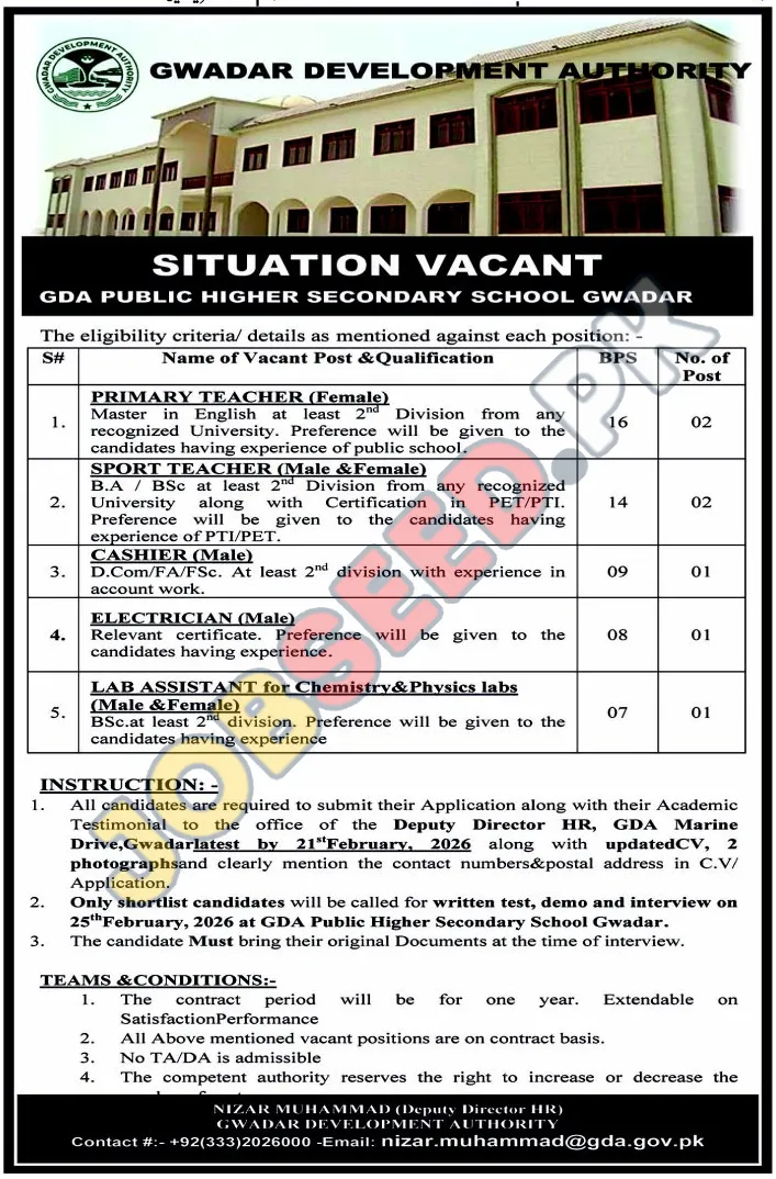 GDA Public Higher Secondary School Gwadar Hiring: Primary Teacher, Sport Teacher, Cashier, Electrician, Lab Assistant