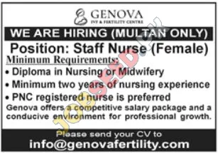 Genova IVF & Fertility Centre, Multan Punjab Pakistan invites applications from eligible candidates for the post of Staff Nurse (Female) as per advertisement of 17 December, 2025, published in Jang Newspaper. Diploma educational qualification will be preferred.