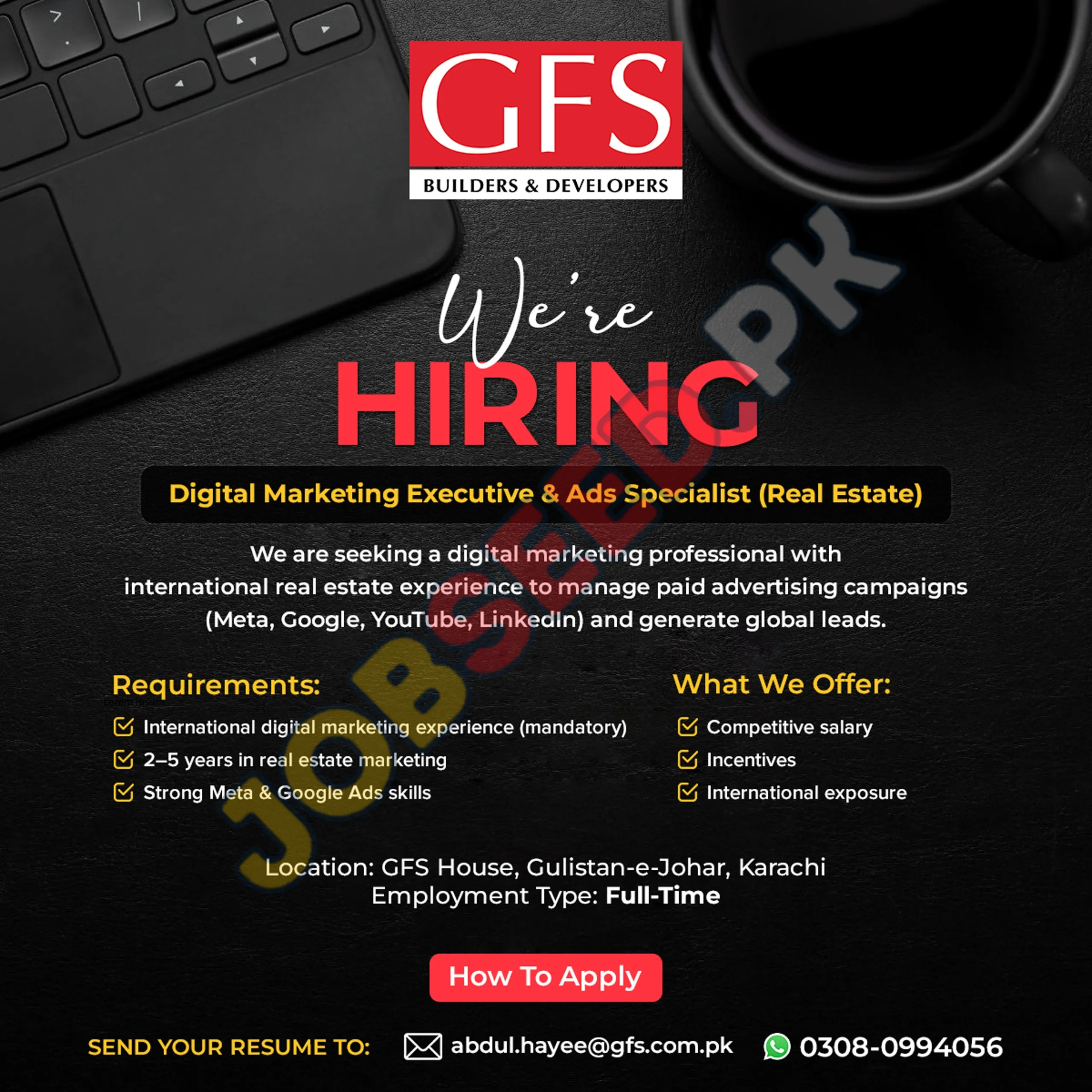 Apply at GFS Builders & Developers, latest jobs in Sales department before closing date which is around 02 January, 2026 or as per closing date in newspaper ad. Read complete ad online to know how to apply on latest GFS Builders & Developers job opportunities. For Further details visit https://www.jobseed.pk.