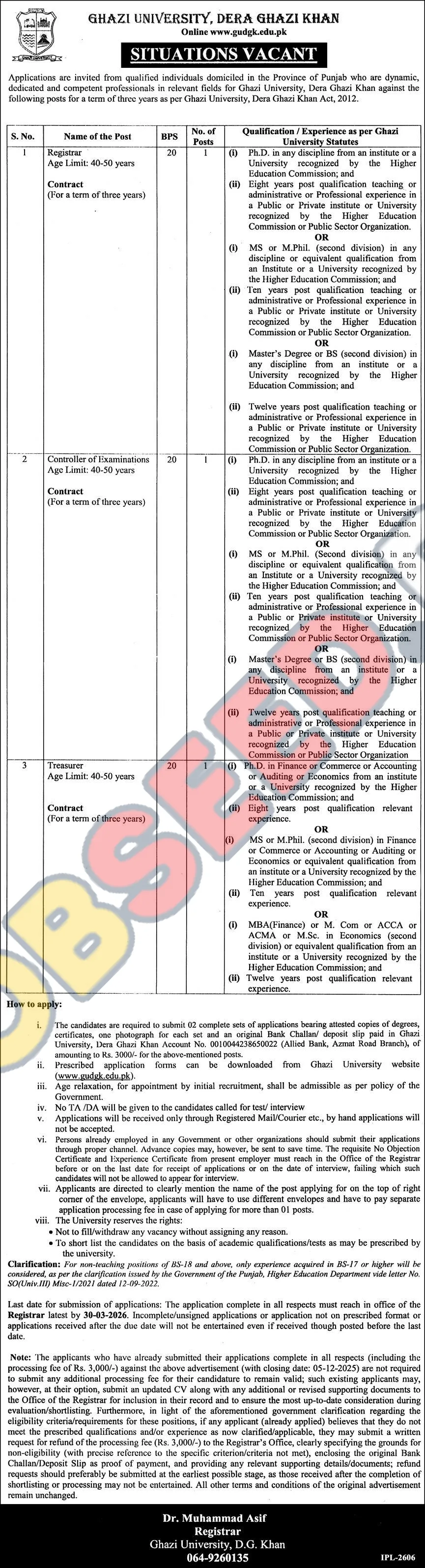 | 1 | Registrar | Ph.D. in any discipline OR MS/M.Phil (second division) in any discipline with 10 years post qualification teaching or administrative experience. | Dera Ghazi Khan | 10 years | N/A | 1 | 40-50 years |