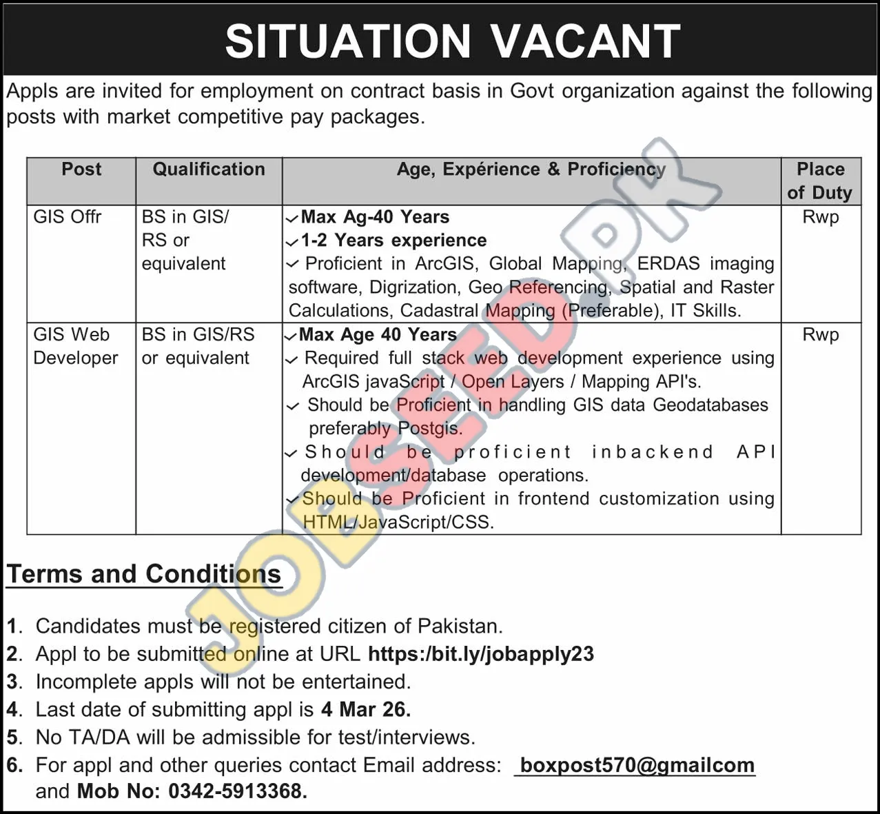 A reputable government organization is actively seeking talented individuals to join their team on a contract basis. These positions offer a chance to contribute to significant projects within the public sector, accompanied by attractive salary packages. If you are a Pakistani national with a passion for Geographic Information Systems and web development, this is an excellent opportunity to advance your career.