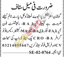 - Office Staff: Seeking individuals with qualifications including FA, BA, B.Sc, and MA. Responsibilities will encompass a range of administrative duties, ensuring smooth office operations.