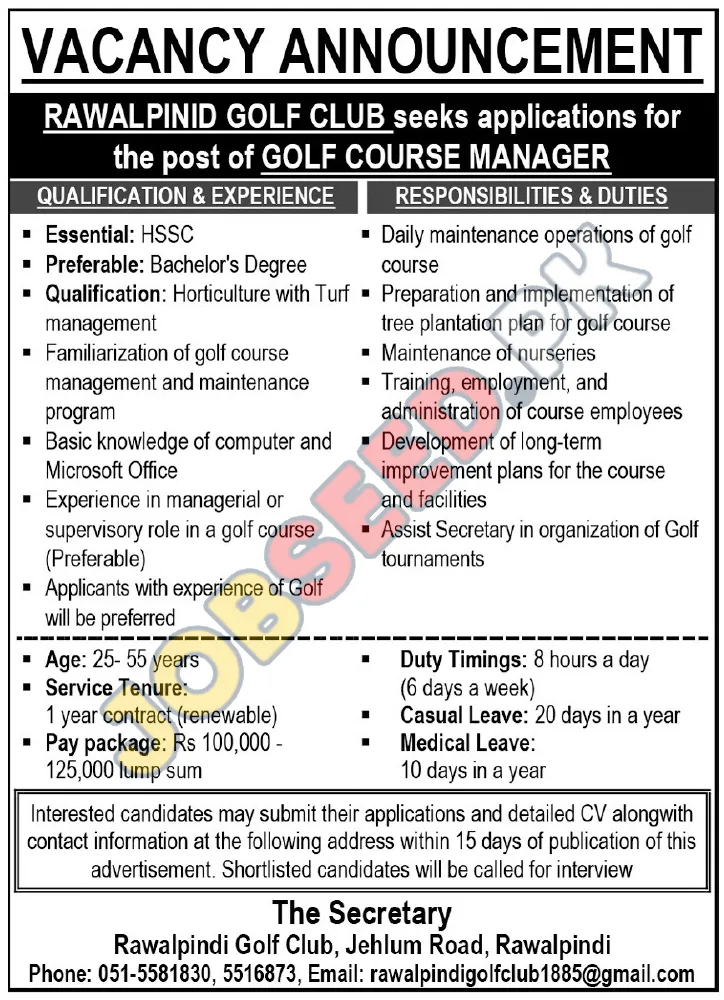 Rawalpindi Golf Club, Rawalpindi invites applications from eligible candidates for the post of Golf Course Manager as per advertisement of 14 January, 2026. Intermediate educational qualification will be preferred.