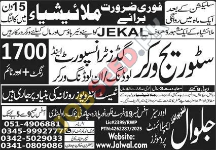 Jalwal Enterprises is now recruiting in Kuala Lumpur Malaysia. Apply for the position of Goods Transport & Storage Worker. The required qualification is Middle. This role is within the Management industry. The application process commenced on 30 November, 2025 via Express Newspaper. Interested and eligible candidates must submit their applications before the deadline on 15 December, 2025. This is a prime opportunity to join a renowned organization. For a step-by-step application guide and full eligibility criteria, please see the official advertisement on https://www.jobseed.pk.