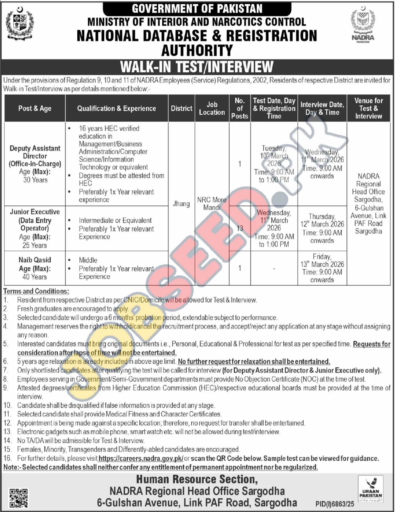 | Deputy Assistant Director (Office-in-Charge) Age (Max): 30 Years | 16 years HEC verified education in Management/Business Administration/Computer Science/Information Technology or equivalent Degrees must be attested from HEC Preferably 1x Year relevant experience | Jhang | NRC More Mandi | 1 | Tuesday, 10th March 2026 Time: 9:00 AM to 1:00 PM | Wednesday, 11th March 2026 Time: 9:00 AM onwards | NADRA Regional Head Office Sargodha, 6-Gulshan Avenue, Link PAF Road, Sargodha |