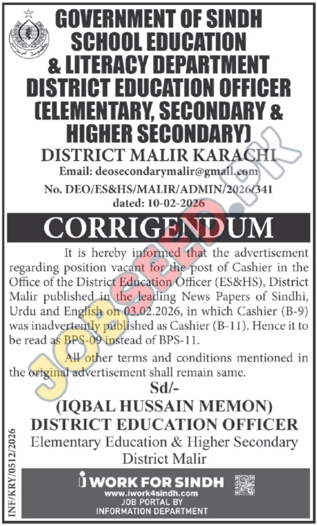 The Government of Sindh School Education & Literacy Department, operating under the District Education Officer in District Malir, Karachi, has issued a correction notice regarding a previously advertised job opening. This corrigendum clarifies the pay scale for the Cashier position. Explore these immediate vacancies with competitive benefits. The original advertisement, published on February 3, 2026, incorrectly listed the position as BPS-11. The updated notice confirms that the Cashier role is actually BPS-09. All other terms and conditions mentioned in the initial advertisement remain unchanged. This presents a valuable opportunity for qualified individuals seeking public sector employment in Karachi. Interested candidates should review the original advertisement details and apply accordingly for this government career opportunity.