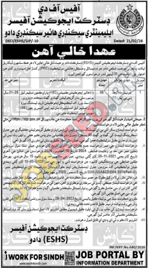 | Job Hiring Organization: | District Education Office (ESHS) Dadu |