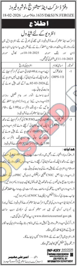 Discover exciting government job opportunities in Noshera and Feroze. The District Sessions Court is conducting interviews for Clerk positions (BPS-11). This is a prime chance for individuals seeking stable government employment and career advancement within the judicial sector. We are looking for diligent candidates to join our team and contribute to efficient court operations. Explore these latest government vacancies and take the first step towards a rewarding public service career.