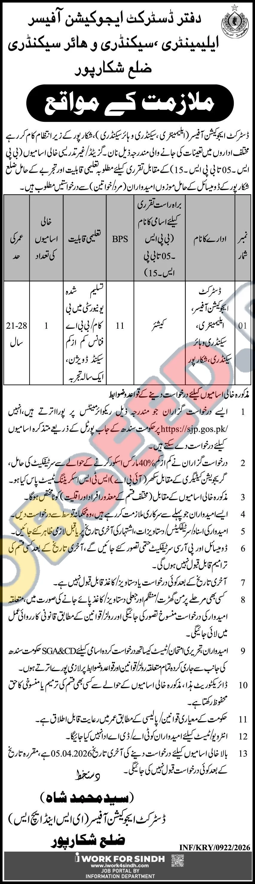 The District Education Office in Shikarpur, Sindh, is announcing multiple government job openings for the position of Clerk. This is an excellent opportunity for individuals looking for stable employment in the public sector. The department is committed to hiring qualified candidates who can contribute to its administrative functions and support the educational goals of the region.