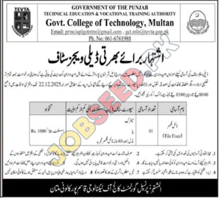 Government College of Technology, Multan Punjab Pakistan invites applications from eligible candidates for the post of Tile Fiser as per advertisement of 16 December, 2025, published in Khabrain Newspaper. Matric educational qualification will be preferred.