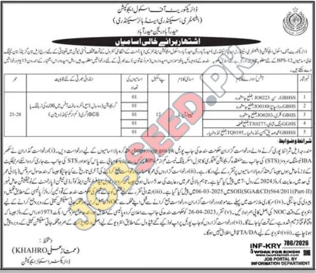 - Department: Directorate of School Education, Hyderabad Region, Sindh
