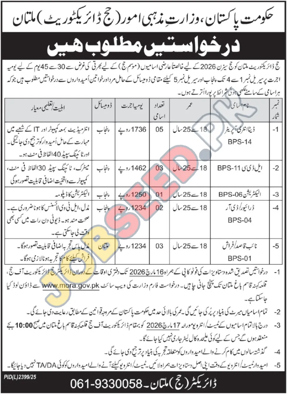 - Online Application: For further details and to download the application form, please visit the official website: www.mora.gov.pk.