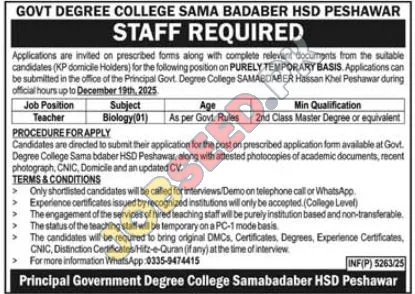 The Govt Degree College Sama Badaber HSD Peshawar has announced faculty positions for suitable candidates. Applications are invited from qualified individuals with KP domicile for a teaching position in Biology. These positions are on a purely temporary basis.
