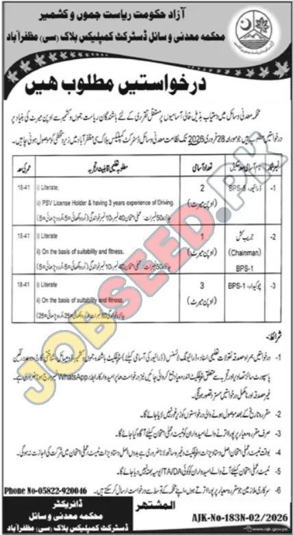 The Azad Government of Jammu and Kashmir's Department of Minerals and Resources is hiring for various support staff positions in Muzaffarabad. Vacancies include Driver (BPS-5), Chainman (BPS-1), and Chowkidar (BPS-1). Applicants must be literate and meet specific experience criteria, particularly for the driver role which requires a PSV license and three years of driving experience. The application deadline is February 28, 2026. These government job openings provide a chance for professional growth within the public sector.