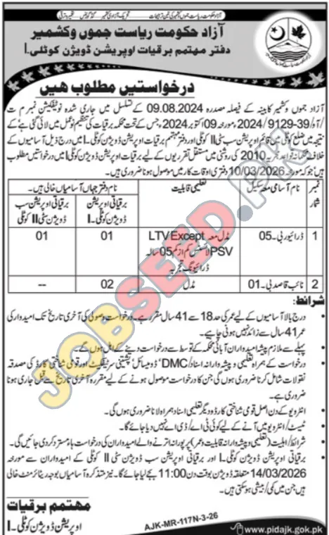 Azad Jammu and Kashmir government is hiring for driver roles within its Operation Division. Additionally, job openings are available for qualified candidates. This public sector employment offers a stable career path for qualified individuals. Key requirements include a valid LTV driving license and a minimum of 5 years of driving experience. The application deadline is March 14, 2026. This is a significant opportunity for those seeking government jobs in the region, offering competitive benefits and a chance for long-term professional development. Learn more about these government vacancies and how to submit your application for this exciting career prospect.
