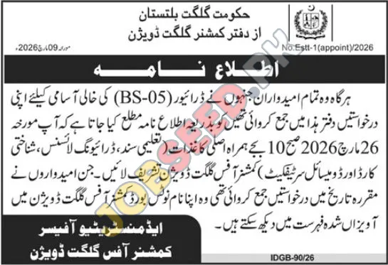 - Interview/Verification: Candidates are required to appear in person at the Commissioner's Office Gilgit Division on March 26, 2026, at 10:00 AM with all necessary original documents.