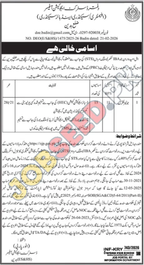 | Job Hiring Organization: | District Education Office (E&HS), Badin |