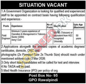 A Government Organization invites applications for the position of Field Engineer on a contract basis. This is an excellent opportunity for experienced professionals to join the public sector. The advertisement highlights the need for skilled individuals with expertise in telecom operations and management within the GSM sector. Interested candidates are encouraged to apply and contribute to the ongoing projects within the government. This is a chance to advance your career and make a meaningful impact.