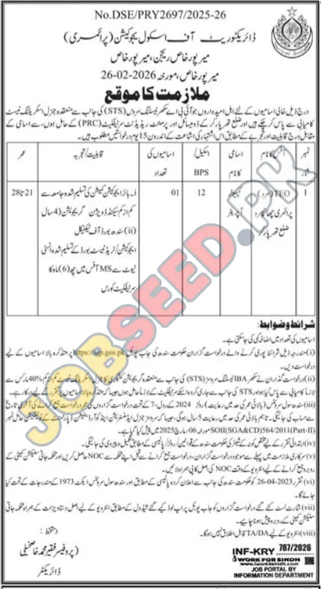 | Job Hiring Organization: | Directorate of School Education, Mirpurkhas Division |