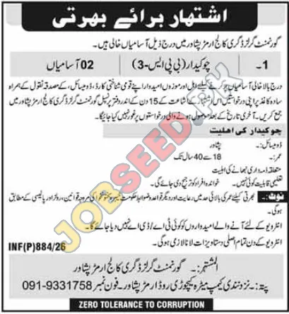 The Government Girls Degree College in Armaz, Peshawar, is seeking dedicated individuals for the position of Security Guard. This is an excellent opportunity for those looking for government jobs in Peshawar. The college is looking to fill vacancies for experienced individuals. Apply now to secure your future career. Competitive salary package with the added benefit of a job in the government sector. These job openings are announced with the aim of employing the best people. The positions are open to candidates with the required qualifications and skills. This is a great career opportunity for those seeking employment in the education sector. Successful candidates will benefit from these latest jobs.