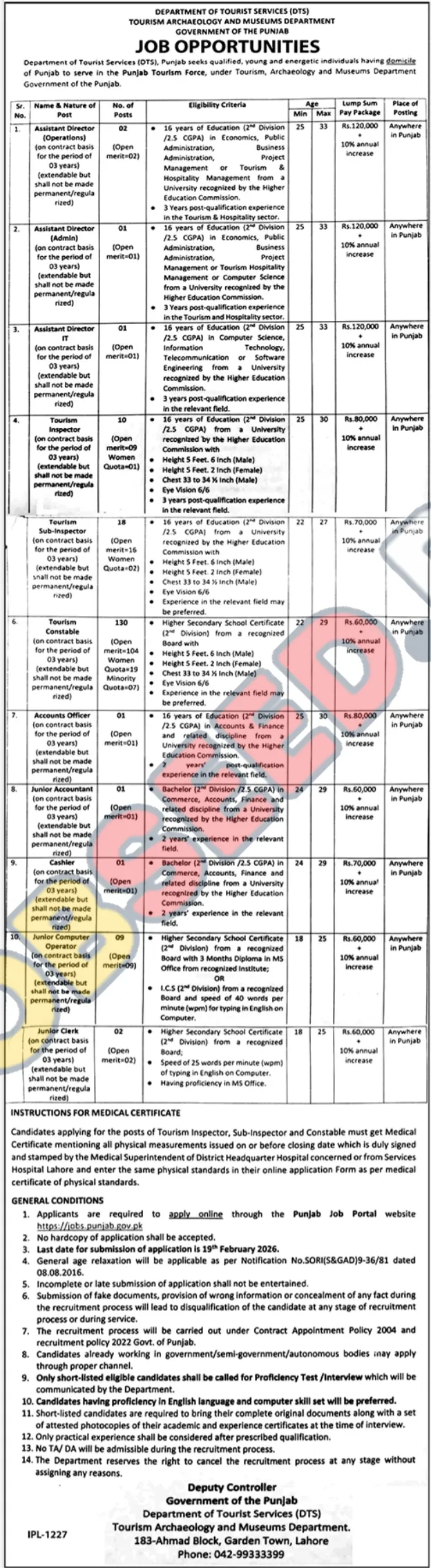 Seeking career-minded individuals! The Department of Tourist Services (DTS), Punjab, a part of the government sector, is hiring Assistant Directors. These contract-based positions offer a competitive salary with a 10% annual increase, along with the opportunity to shape the future of Punjab's tourism and cultural heritage. We are looking for talented individuals with relevant experience to join our team. With these job openings, you’ll be a part of latest jobs and benefit from professional growth in a stable environment. Apply now for this exciting career opportunity!