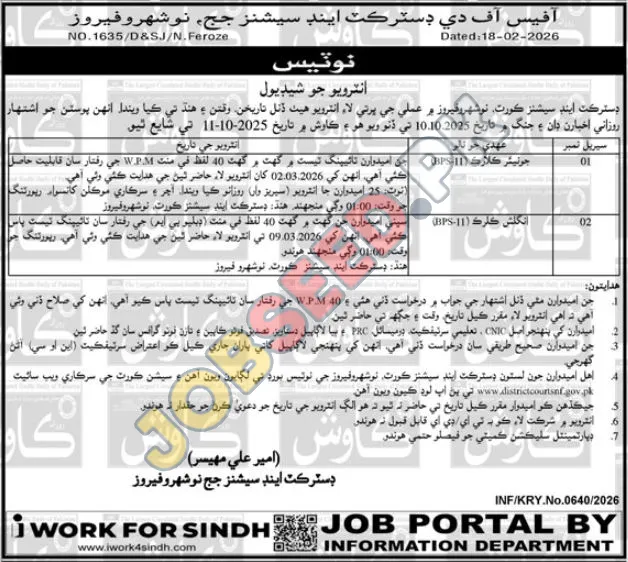 - Location: The interviews will be conducted at the office of the District & Sessions Judge, Noshero Feroze.