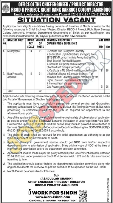 Government job vacancies announced by the Office of the Chief Engineer / Project Director, RBOD-II Project, Jamshoro, Sindh. Seeking candidates for Data Processing Assistant and Stenographer roles. This opportunity is ideal for those looking for a career in the Irrigation Department, Government of Sindh. We prioritize candidates with relevant educational backgrounds and a commitment to public service. Explore these latest Sindh government jobs and advance your career in a reputable organization.