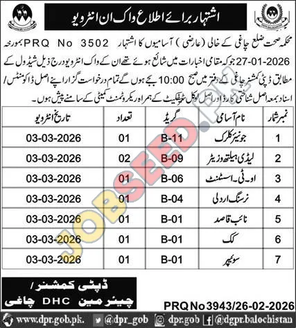 The District Health Department (DHC) in Chagai, Balochistan, is currently hiring for various vacant positions. These are temporary opportunities. Interested candidates are required to attend a walk-in interview, presenting their original documents alongside their CNIC and local certificate. This drive provides a gateway to government jobs in the health sector. The walk-in interviews are scheduled to begin on March 03, 2026.
