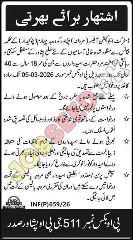 The District Education Officer (Male) Peshawar has announced career opportunities for Drivers, a 4th grade position, in the Finance Department. Those seeking government jobs are encouraged to apply. The posts are for residents of Peshawar; thus, it is a great chance for local candidates searching for latest jobs and vacancies. Applicants must be between 18 and 40 years old. Explore these immediate vacancies with competitive benefits. This is a chance for employment in the government sector.