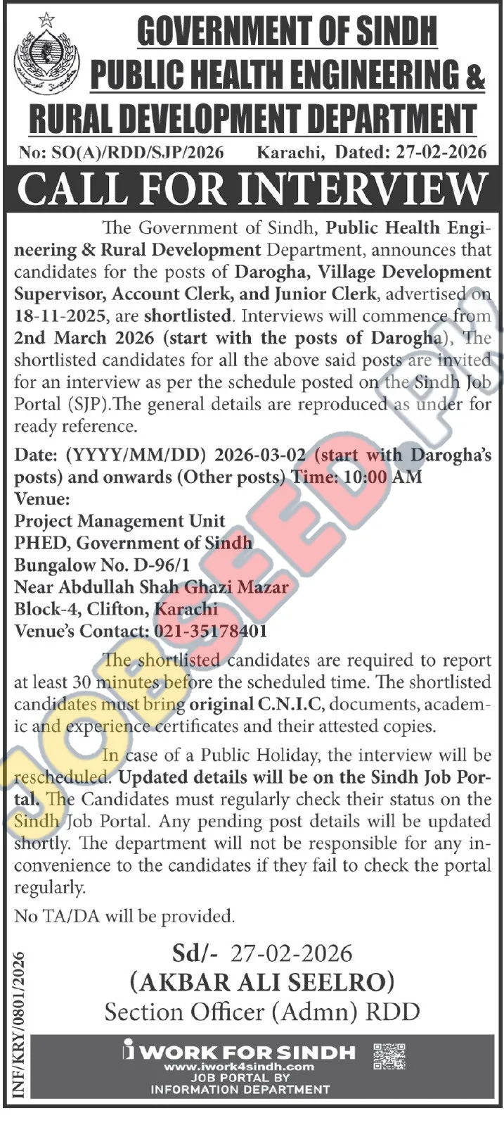 The Government of Sindh's Public Health Engineering & Rural Development Department is inviting shortlisted candidates for interviews for multiple positions, including Darogha, Village Development Supervisor, Account Clerk, and Junior Clerk. These government jobs offer a chance to work in the public sector, providing career stability and growth. The interviews for the available positions will start on March 2nd, 2026. The positions are located in Karachi, Sindh. Interested applicants should bring their C.N.I.C, academic documents, experience certificates, and their attested copies for the interview.