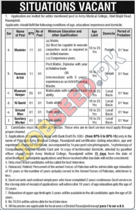 - Application Submission: Interested candidates must submit their applications along with a Bank Draft of Rs. 500/- (from BPS-5 to BPS-16) payable to the Principal Army Medical College, Rawalpindi.