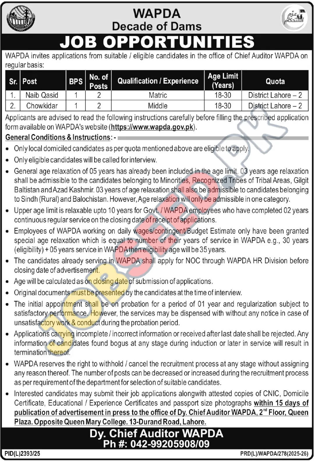 - 🏢 Send your application to the office of Dy. Chief Auditor WAPDA, 2nd Floor, Queen Plaza, Opposite Queen Mary College, 13-Durand Road, Lahore.