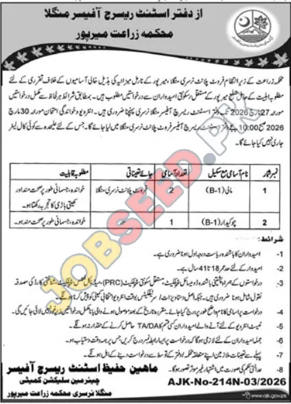 The Azad Kashmir Department of Agriculture in Mirpur seeks qualified candidates for Assistant Research Officer positions at its Mangla Nursery. These government jobs require specific qualifications and experience. Apply by March 27, 2026, to be considered for these key employment opportunities. The job offers a platform for professional growth in the agricultural sector. The government sector role promises a competitive salary package. Additionally, best career opportunities are available for qualified candidates. Don't miss this opportunity in the government sector.