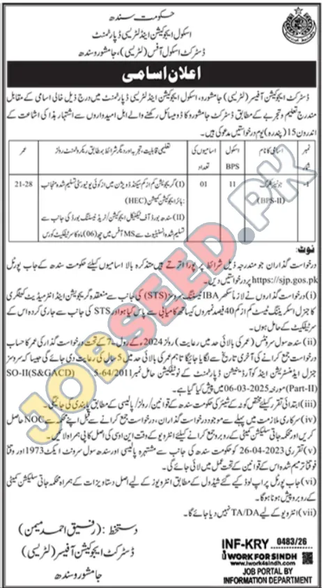 | Job Hiring Organization: | District School Office (Literacy), Jamshoro |