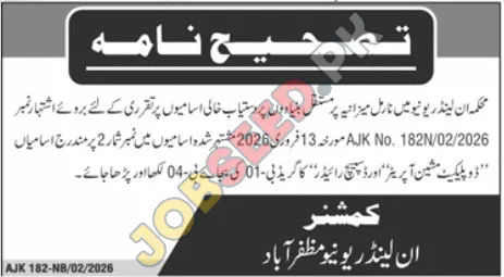The Inland Revenue Department in Muzaffarabad, Azad Jammu and Kashmir (AJK), has issued a correction notice regarding recent government job vacancies. This announcement clarifies the pay scale for specific positions advertised previously. Explore these Driver jobs Muzaffarabad with competitive benefits. Candidates interested in public sector employment in Muzaffarabad should note the updated details for the Duplicate Machine Operator and Outside Rider roles. The department is seeking qualified individuals for these positions on a regular basis under the normal budget. This correction ensures applicants are aware of the revised pay grade before applying for these career opportunities. The original advertisement was published on February 13, 2026, and this notice updates the pay scale for the specified roles.