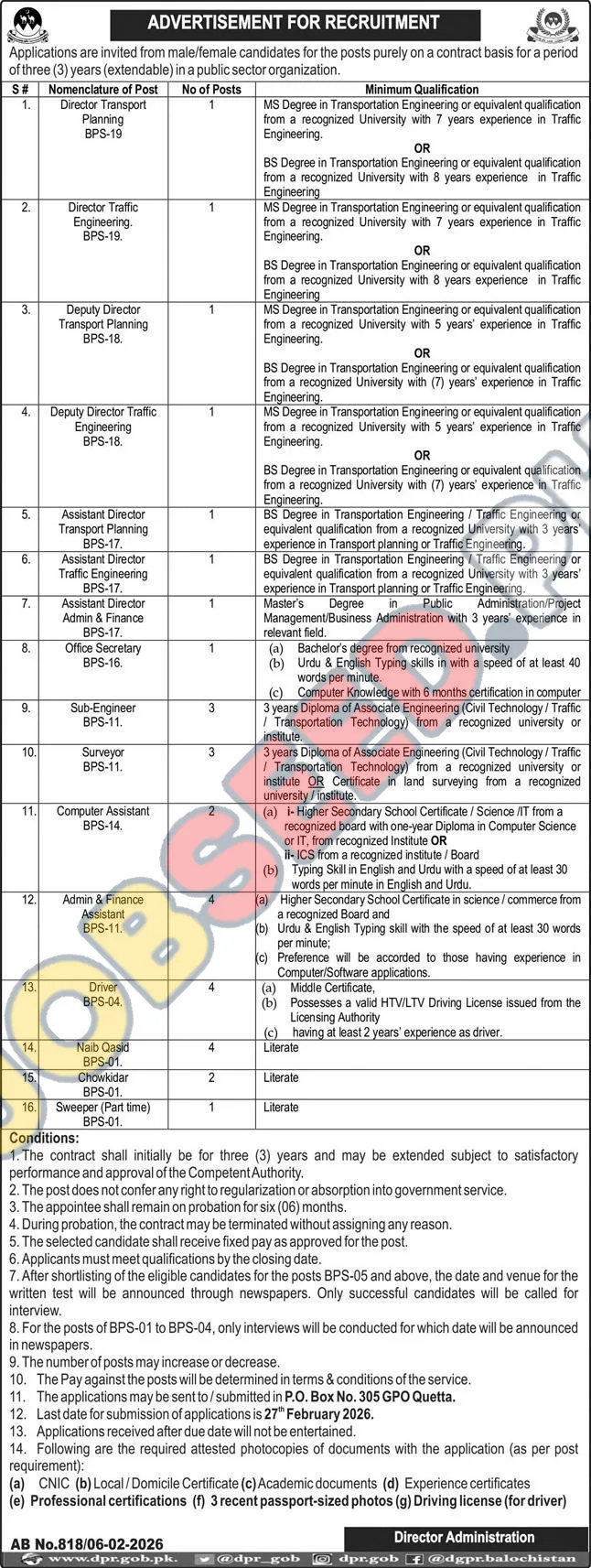 The Government of Balochistan is offering exciting career opportunities for experienced professionals. Various positions are available, including Director, Deputy Director, Assistant Director, and others in transport, traffic engineering, and administration. This is a chance to secure government employment and contribute to public sector initiatives. Apply by February 27, 2026, to take advantage of these latest job openings.